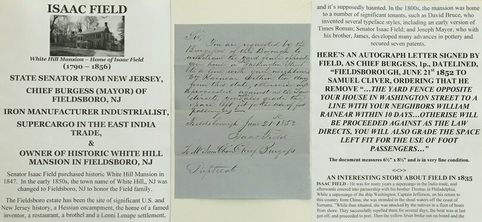 Title (ebay affiliate link): STATE SENATOR NEW JERSEY MAYOR FIELDSBORO IRON INDUSTRIALIST LETTER SIGNED 1852!