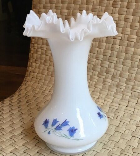 VINTAGE VICTORIAN VASE CORNFLOWER BLUE FLOWERS ON WHITE OPAQUE GLASS RUFFLE EDG