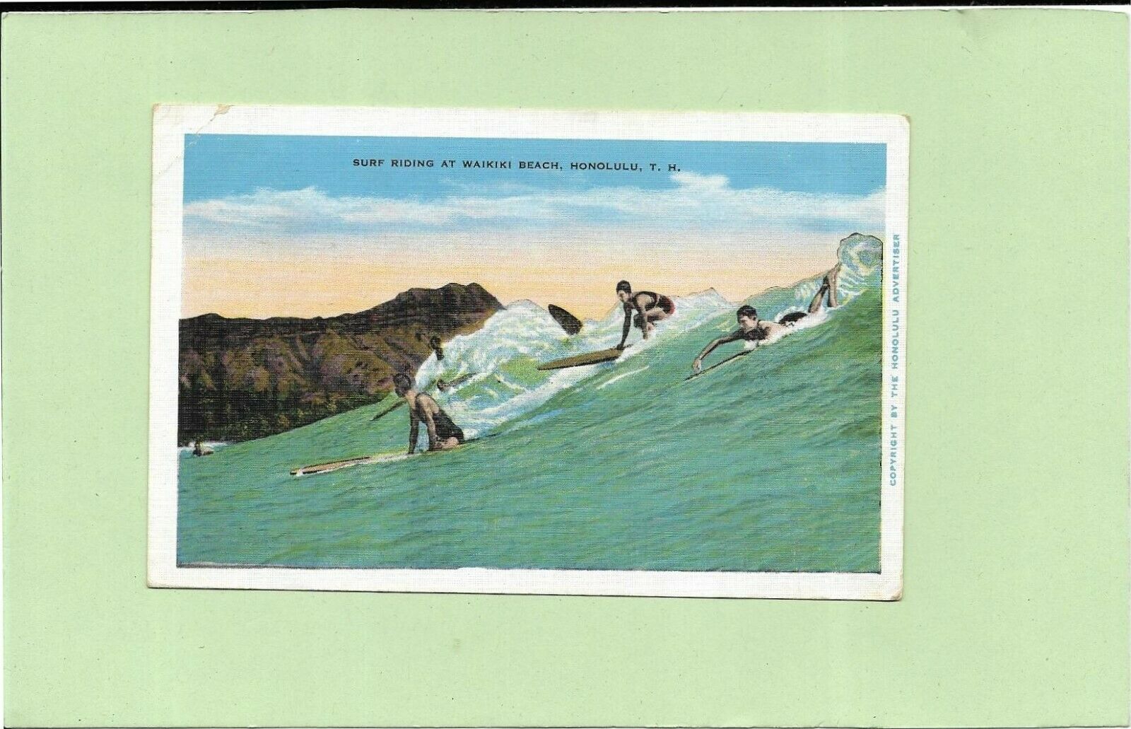 Title (ebay affiliate link): HONOLULU-SURF RIDING AT WAIKIKI BEACH--Old Postcard---c1935-USA.