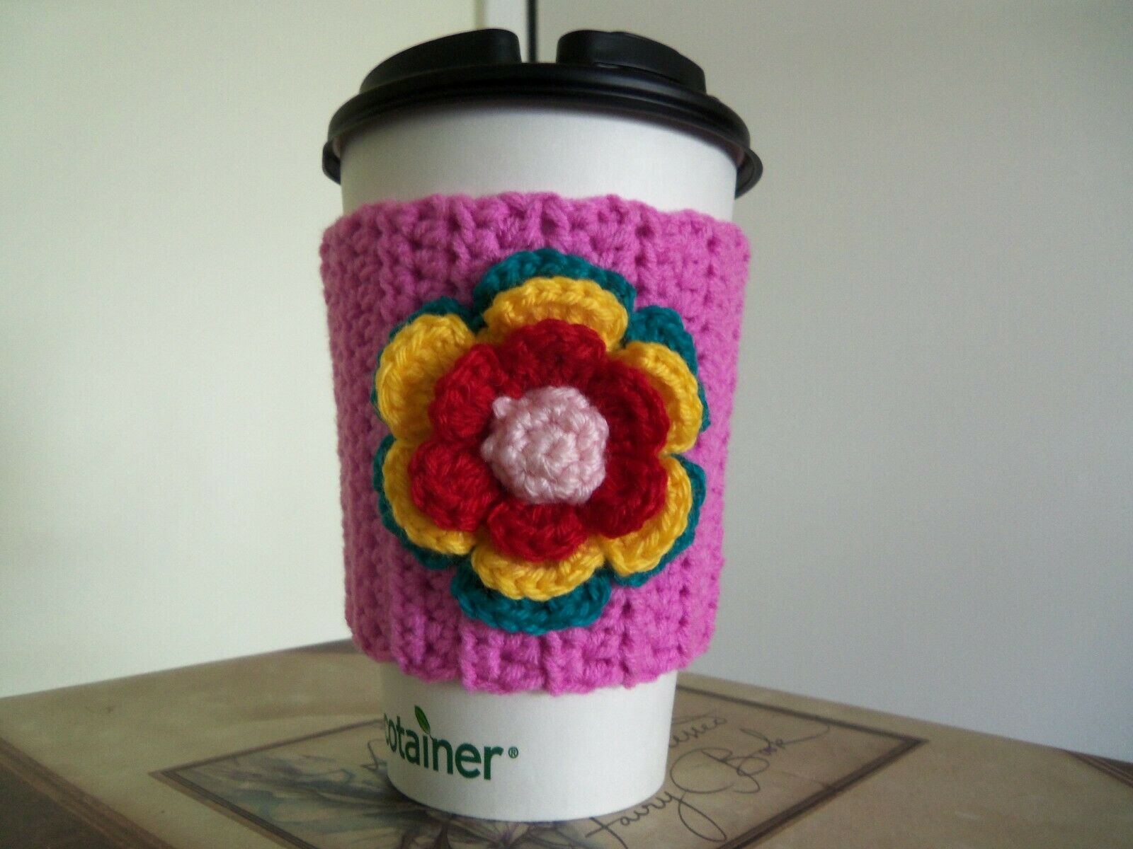 Title (ebay affiliate link): Crochet Cup Cozy With A Crochet Flower. Crochet Cup Cozy.
