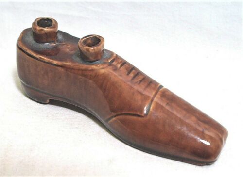 ANTIQUE YELLOW WARE GENTLEMAN''S SHOE 4 5/8" CERAMIC FIGURAL DOUBLE INKWELL