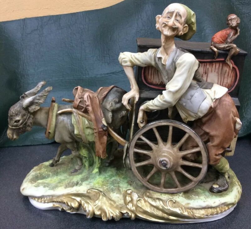 Title (ebay affiliate link): Capodimonte Porcelain Donkey Cart Organ Grinder W/ Monkey Music Box.