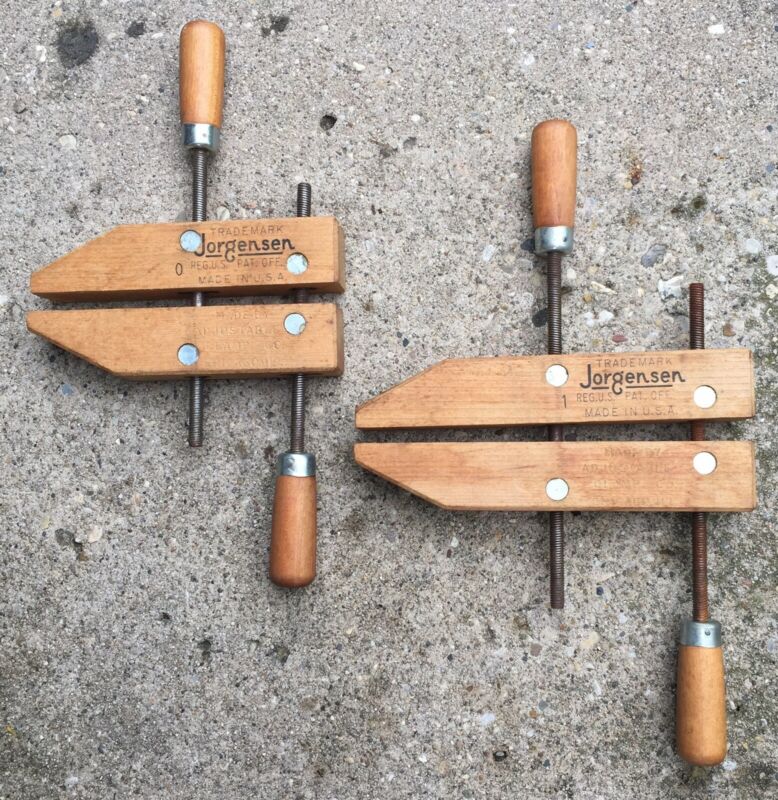 Title (ebay affiliate link): Two JORGENSEN HAND SCREW WOOD CLAMPS 6" & 8" Jaws - Adjustable Clamp Co. Chicago