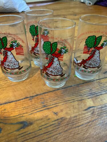 Title (ebay affiliate link): VTG Set of 4 Holly Hobbie Coca Cola Christmas Holiday Glasses Girl Tree Cat Xmas