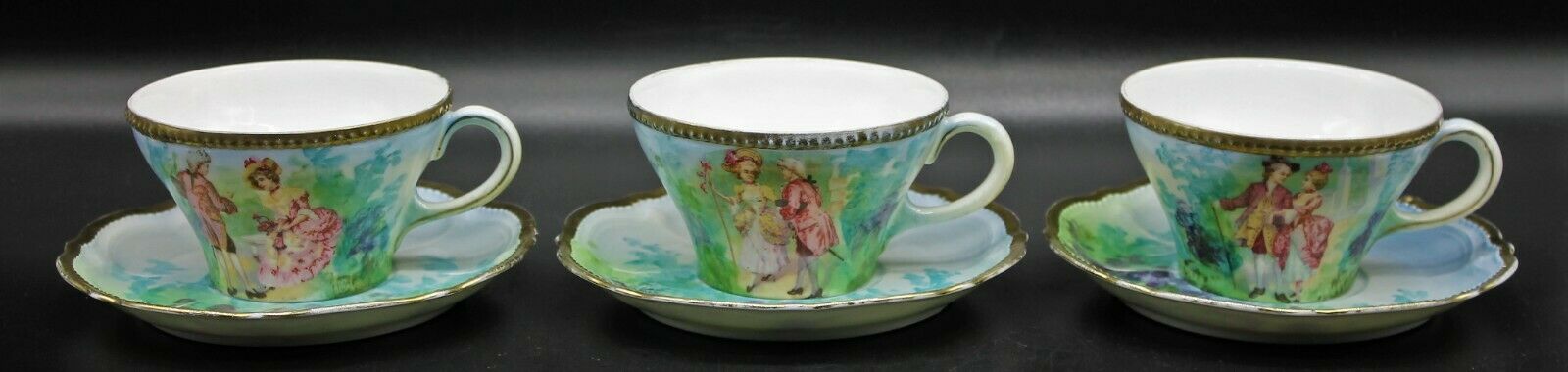 Three Victorian Schwarzburg Hand Painted Tea Cups & Saucers Couples Courting