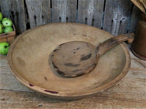 Title (ebay affiliate link): AAFA Early Antique Primitive Wood Dough Bowl w/ Rim & Hooked Scoop 13"