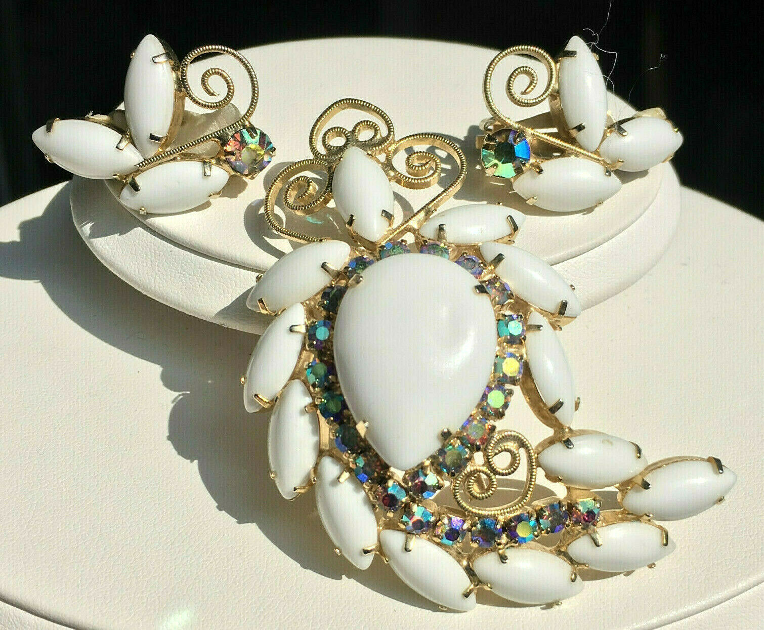 Vintage Juliana White Milk glass AB rhinestone pin earrings set cascade Wedding