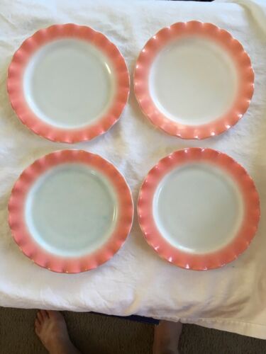Four Atlas Hazel Dinner Plates Milk Glass Pink Ruffle Crinoline (50s)