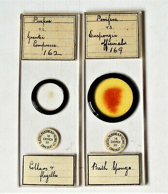 Title (ebay affiliate link): Pair Antique MICROSCOPE SLIDES by FLATTERS MILBORNE etc. of SPONGE SECTIONS