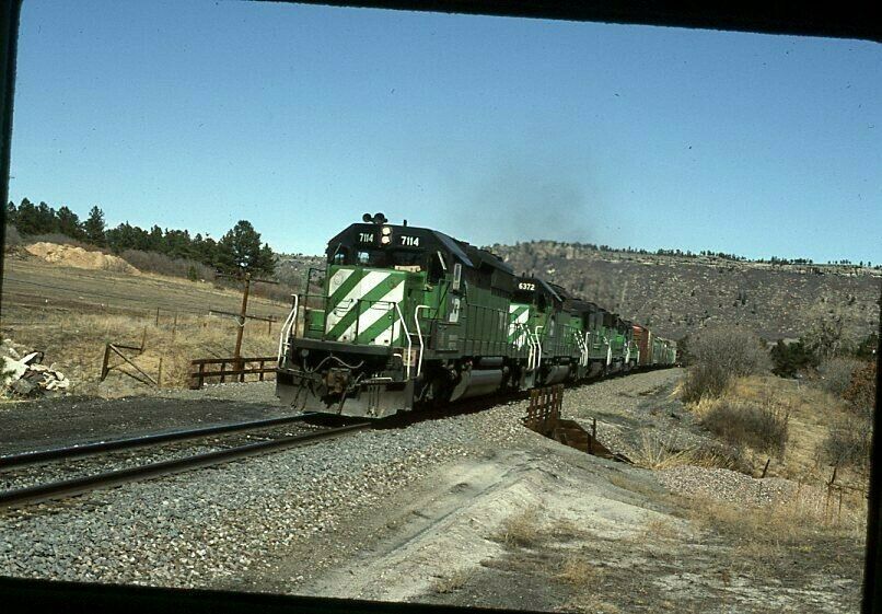 Title (ebay affiliate link): Burlington Northern SD40-2 # 7114 action @ Larkspur, CO 3/07/1993