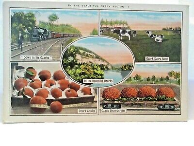 1920 POSTCARD IN THE BEAUTIFUL OZARK REGION,APPLES,STRAWBERRIES, DAIRY, TRAIN