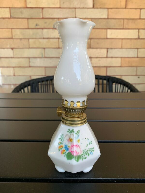 Vintage Miniature Milk Glass Floral Oil Lamp Light