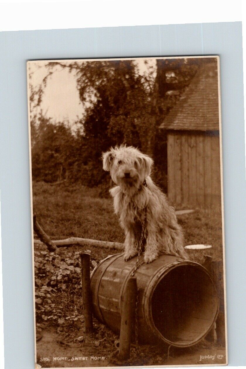 postcard real photo rppc DOG SITTING ON HIS BEER BARREL DOGHOUSE CANINE CARD