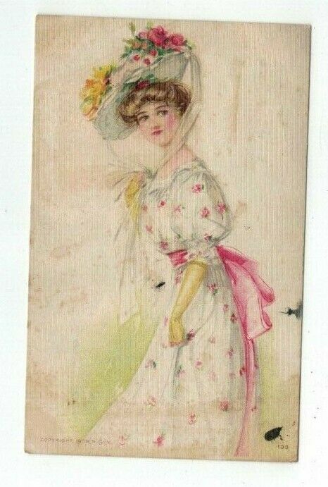 Antique 1909 NGY Pretty Lady Post Card Lady in Pretty Dress & Flowery Hat
