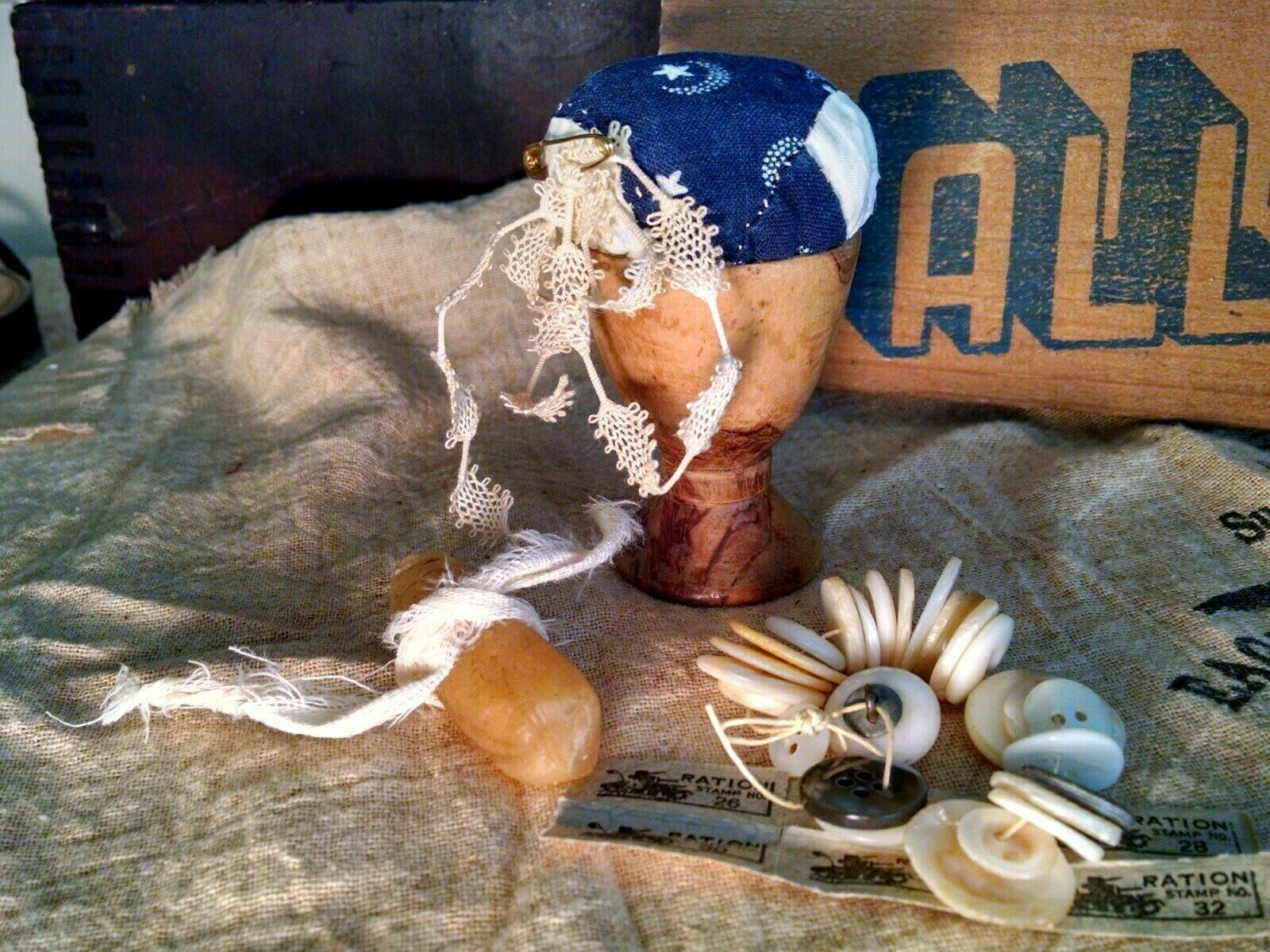 OOAK PRIMITIVE PIN CUSHION BURL PINKEEP 1890 QUILT + ANTIQUE LACE + VTG BUTTONS