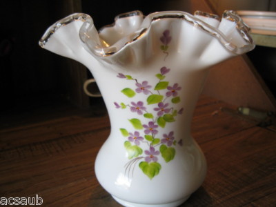 Fenton Milk Glass ruffled vase signed D Johnson violets