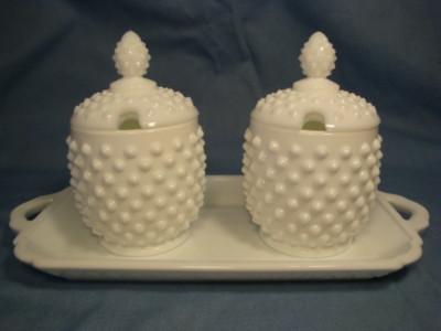 FENTON MILK GLASS HOBNAIL JAM CONDIMENT JAR SET W/ TRAY
