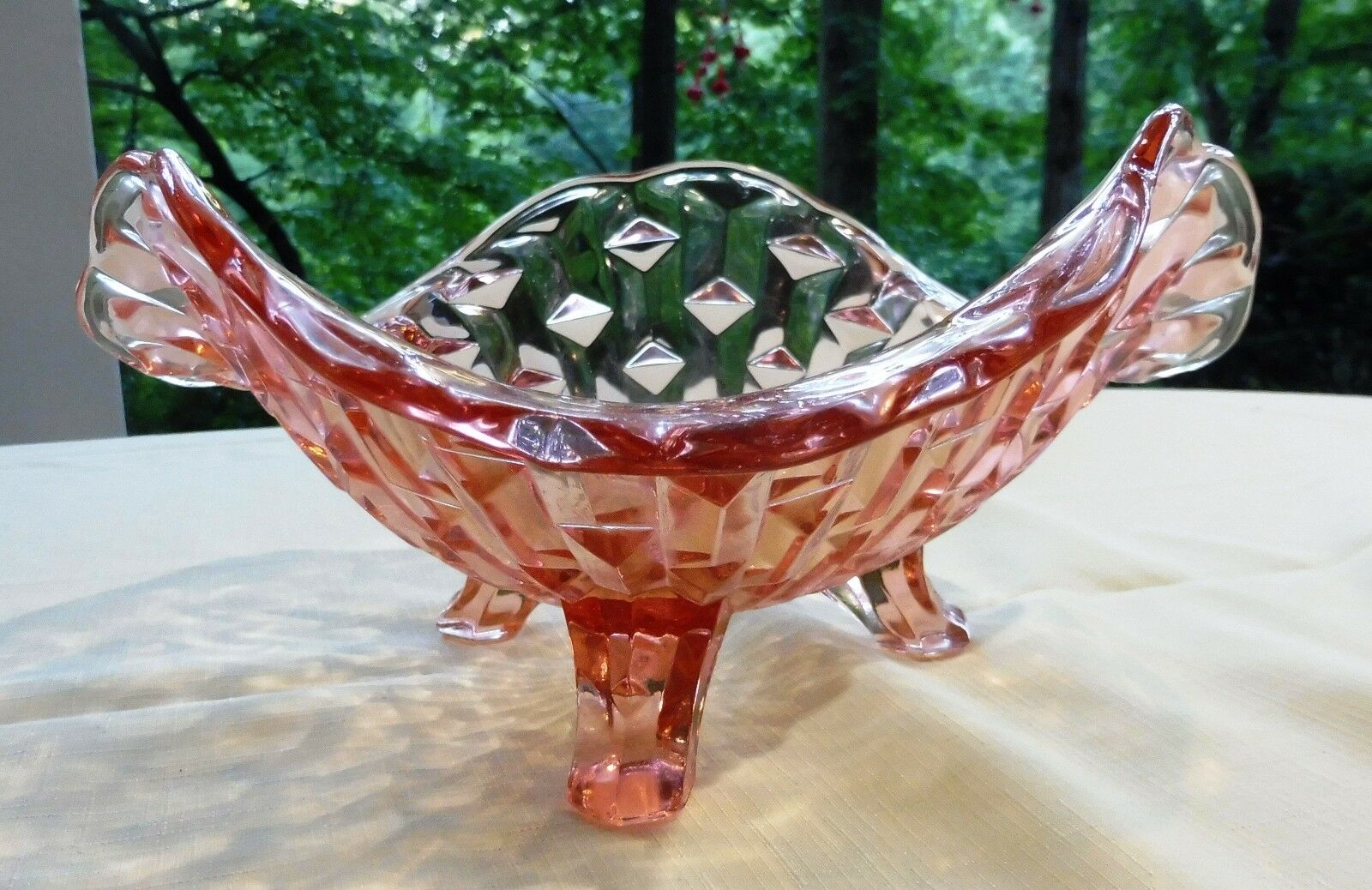 Title (ebay affiliate link): 3-Toed Pink Ruffled Candy-Bonbon Dish Jeannette Cube-Cubist Diamond Bit (?) Mint