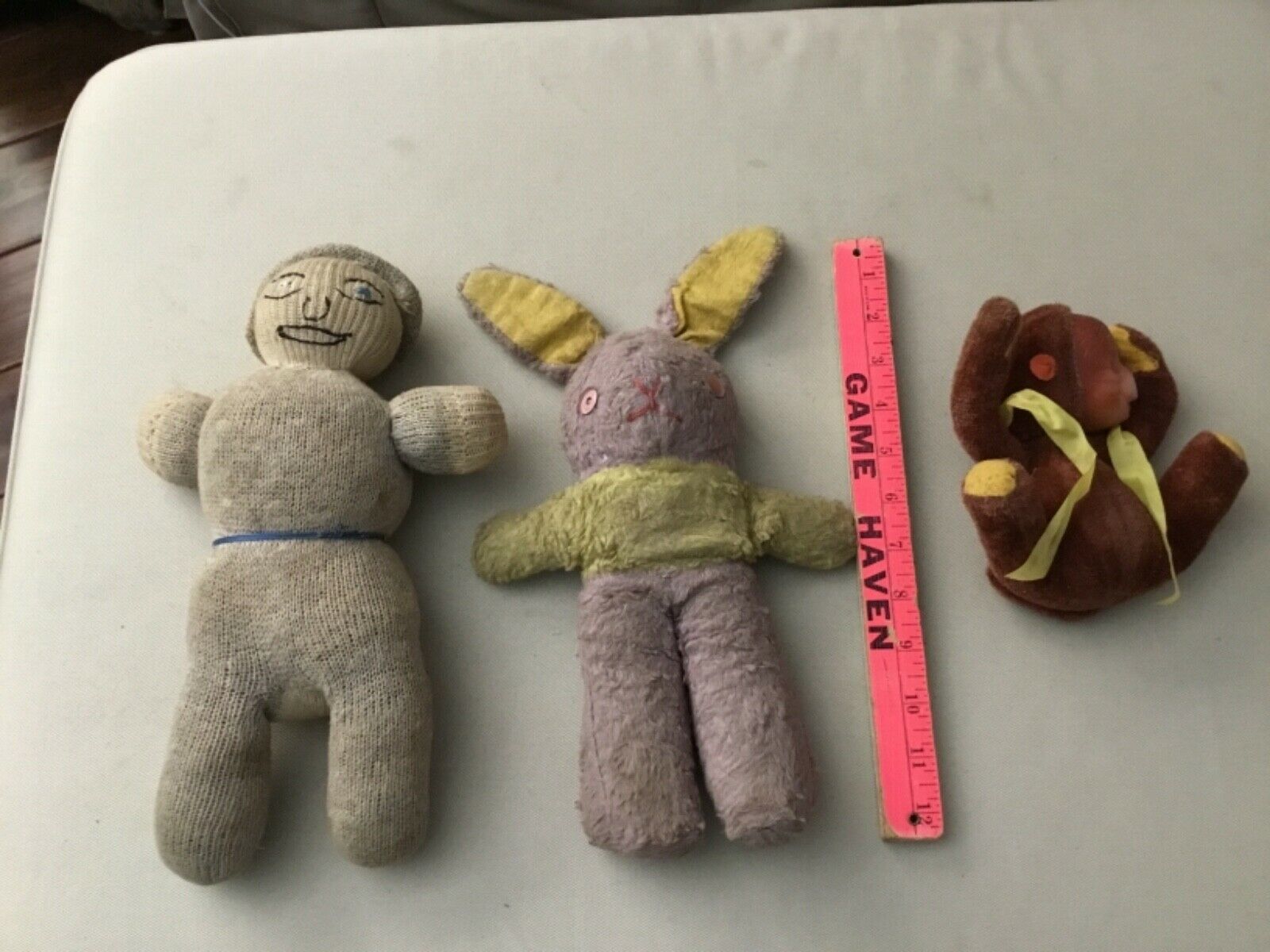 Title (ebay affiliate link): 3 ANTIQUE PRIMITIVE SOCK DOLL, RABBIT, AND A MONKEY, EXCELSIOR, STUFFED TOYS