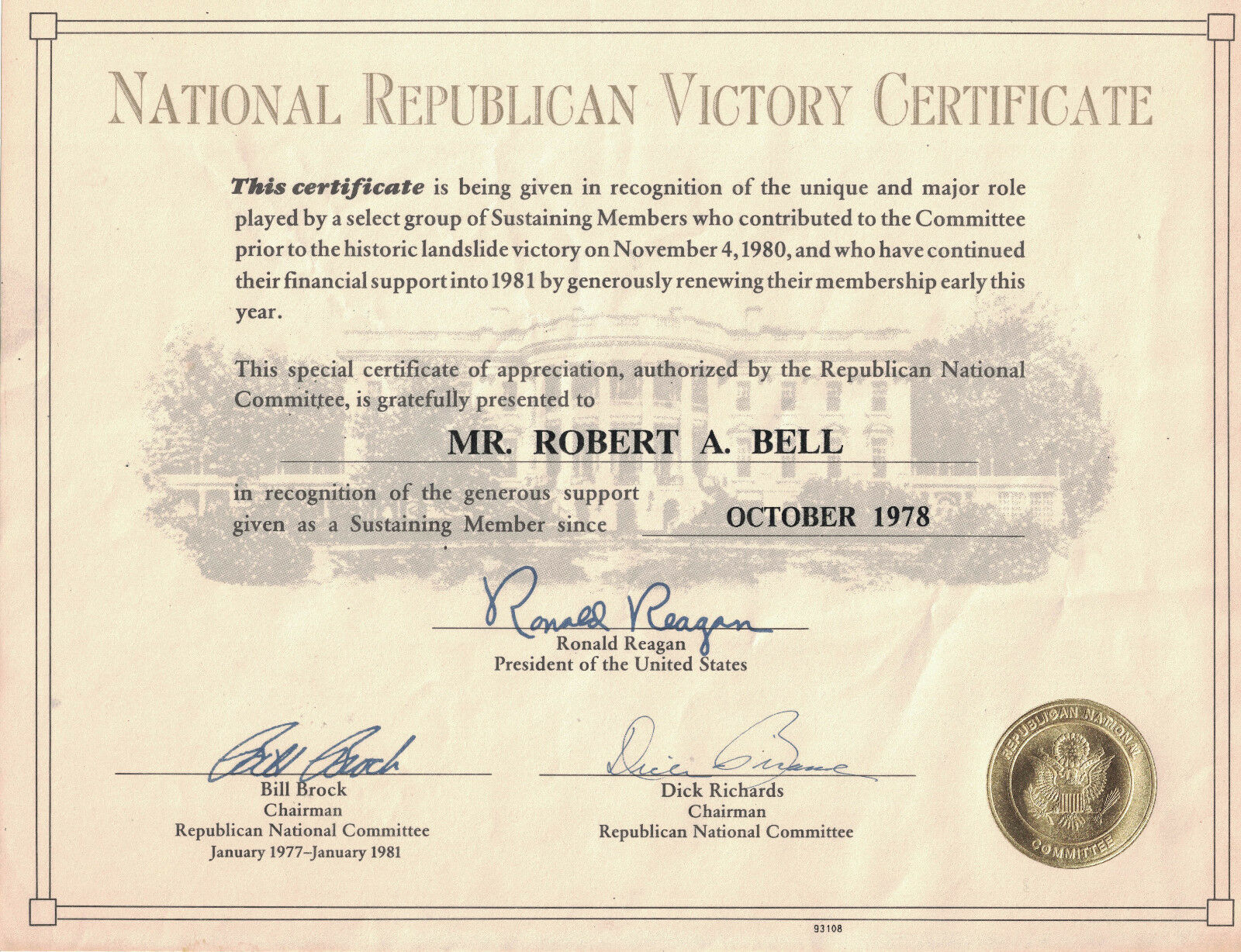 National Republican Victory Certificate. Ronald Reagan Signature 1981 - 8.5"x11"