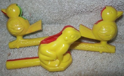 3 VINTAGE W. GERMANY PLASTIC TOY BIRD / FROG WHISTLES
