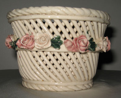 VINTAGE CAPODIMONTE WOVEN BASKET ROSES ITALY ITALIAN