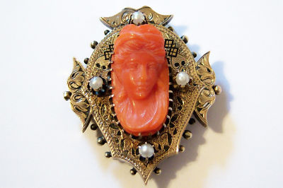 Title (ebay affiliate link): Victorian Coral Cameo 10k Gold Brooch Watch Pin Antique