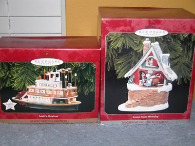 Title (ebay affiliate link): 2 Hallmark Light & Motion Ornaments-Showboat & Workshop