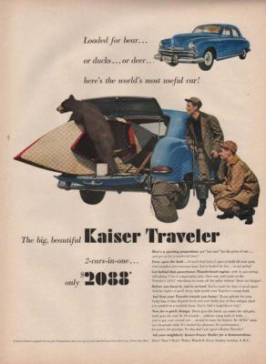 Title (ebay affiliate link): 1949 VINTAGE KAISER TRAVELER BEAR IN BLUE CAR PRINT AD