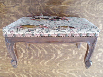 ANTIQUE HAND CARVED EMBROIDERED FOOTSTOOL