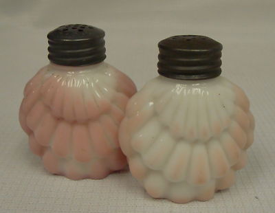 EAPG MILK GLASS OVERLAPPING SHELL SALT & PEPPER SHAKERS