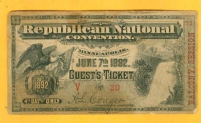 Title (ebay affiliate link): JUNE 7 1892 REPUBLICAN NATIONAL CONVENTION GUEST TICKET