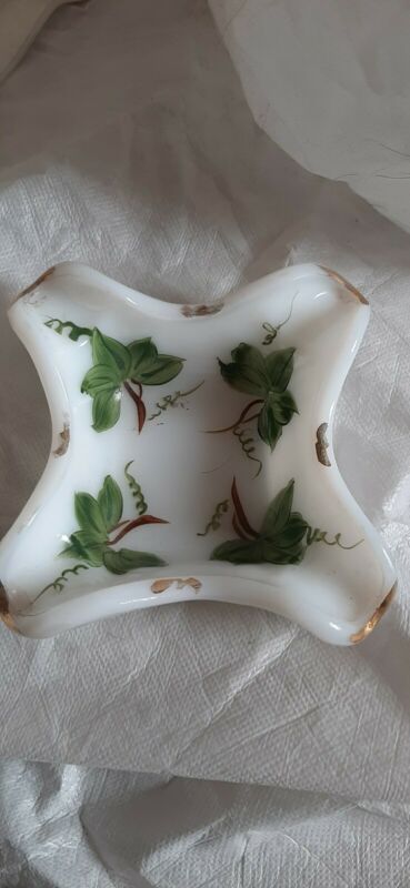 Vintage Milk Glass Trinket Dish Painted With Leaves And Gold Accents