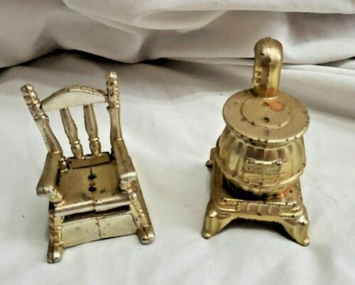 Vintage Gold Tone Rocking Chair & Pot Belly Stove Metal Salt and Pepper Shakers