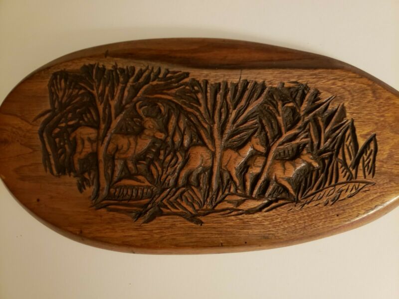 Hand Carved Wooden Wall Plaque w/Deer in Forest 14 3/4" x 7 1/8"