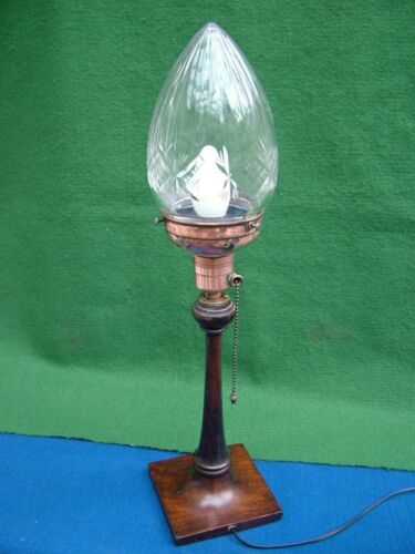 ORIGINAL ARTS & CRAFTS MAHOGANY TABLE LAMP COPPER FITTINGS CUT GLASS ACORN SHADE