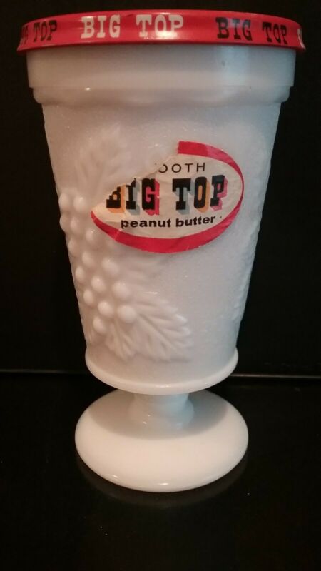 Title (ebay affiliate link): Vintage Milk glass Grape Design Footed Goblet Full of Big Top Peanut butter.