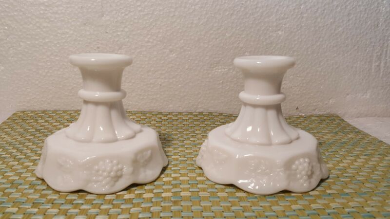 Westmoreland Milk Glass Footed Candlesticks Paneled Grape