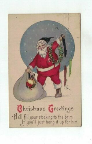 Antique 1923 Stecher Christmas Post Card Santa with Pack of Toys and Stockings