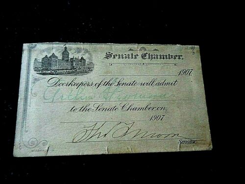 Title (ebay affiliate link): 1907 Admittance Card Senator Arthur Stevenson Political Senate Chamber