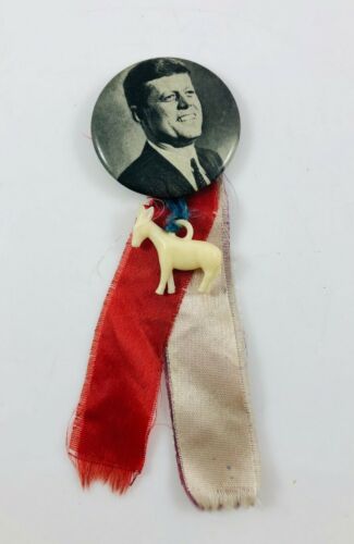 Title (ebay affiliate link): Vintage JFK Kennedy B&W Photo Portrait Pin Back Button w/Ribbons&Plastic Donkey