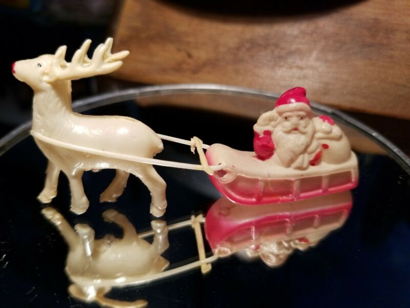 Vintage 1940s Christmas Tiny Celluloid Reindeer & Santa Claus in Sleigh. 3"