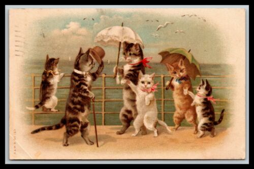 Title (ebay affiliate link): CATS WALKING ON BOARDWALK WITH UMBRELLAS POSTCARD
