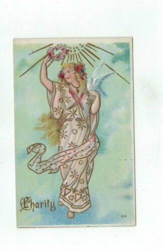 Title (ebay affiliate link): Antique Embossed Greeting Post Card "Charity" Full-Body Angel Lady Doves Clouds