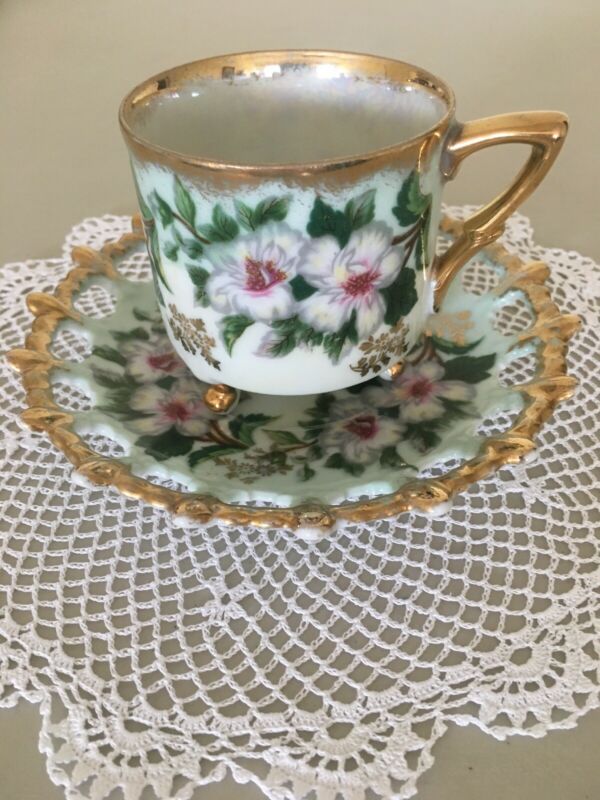 Vintage Footed Tea Cup Saucer Hibiscus Flowers Japan Gold Cutwork Iridescent