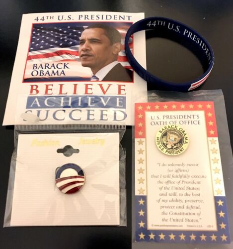 Title (ebay affiliate link): BARACK OBAMA Swag! Lapel Pins (Presidential Seal & Hope Logo) & 2-Sided Bracelet
