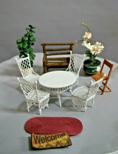Title (ebay affiliate link): Lot Dollhouse furniture twisted iron patio set, wood bench, folding chair plants
