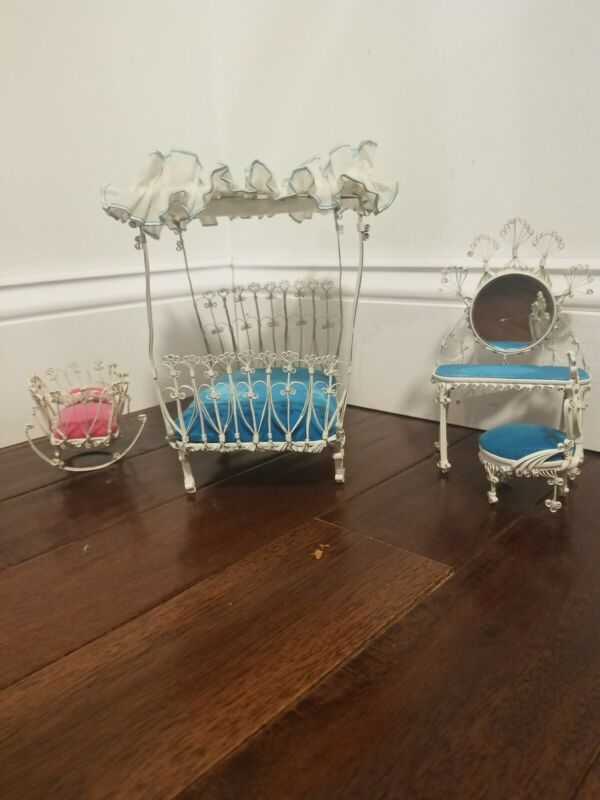 Title (ebay affiliate link): Vintage Antique Iron Canopy Bedroom LOT Vanity Baby Cradle White Bed Set Mini
