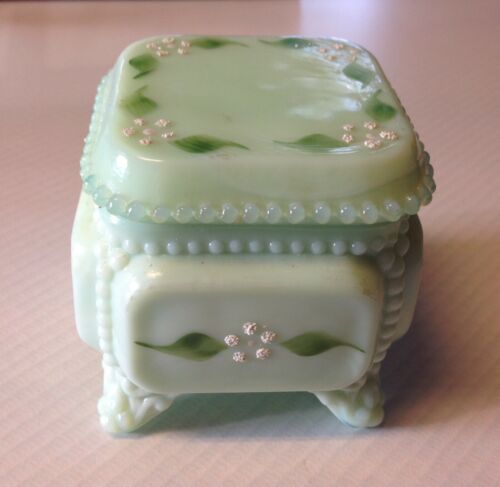 1979 Westmoreland Jadeite Green Milk Glass Hand Painted SIgned Trinket Box