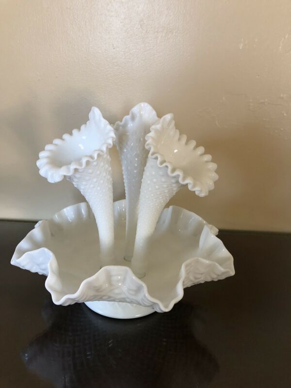 Title (ebay affiliate link): Vintage Fenton Hob Nail Milk Glass Epergne 3 Horn Floral Vase